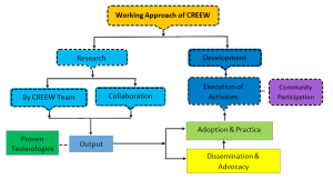 On the research front CREEW works through its own initiatives and/or collaboration whereas on development front it works in collaboration with local government and non-government organizations. All the work executed by CREEW are scientific research based. The working approach of the CREEW is described in the figure